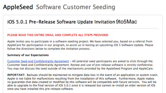 Alcuni utenti, che hanno contattato il servizio clienti lamentando la minor durata della batteria dei propri dispositivi iOS, hanno ricevuto una mail che li informa dell’inclusione nel programma AppleSeed. Gli utenti potranno perciò installare una pre-release del prossimo firmware iOS 5.0.1, ma se accettano non potranno successivamente effettuare il downgrade ad iOS 5; sarà possibile invece aggiornare alla versione finale non appena verrà rilasciata ufficialmente.