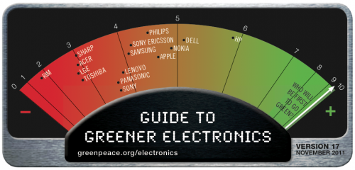 Apple continua a conseguire buoni punteggi sui prodotti: tutti sono privi di PVC e bromurati. L’azienda guadagna punti anche per le informazioni che fornisce sulla vita delle batterie e sul criterio del ciclo vitale dei prodotti ma deve rivelare pubblicamente la durata della garanzie e la reperibilità dei pezzi di ricambio delle sue maggiori linee. Non fornisce informazioni sul loro uso nel riciclaggio delle plastiche.