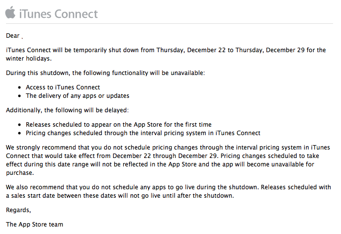 Come ogni anno, la Apple ha inviato la mail agli sviluppatori in cui informa che durante le vancanze invernali, iTunes Connect non sarà disponibile.