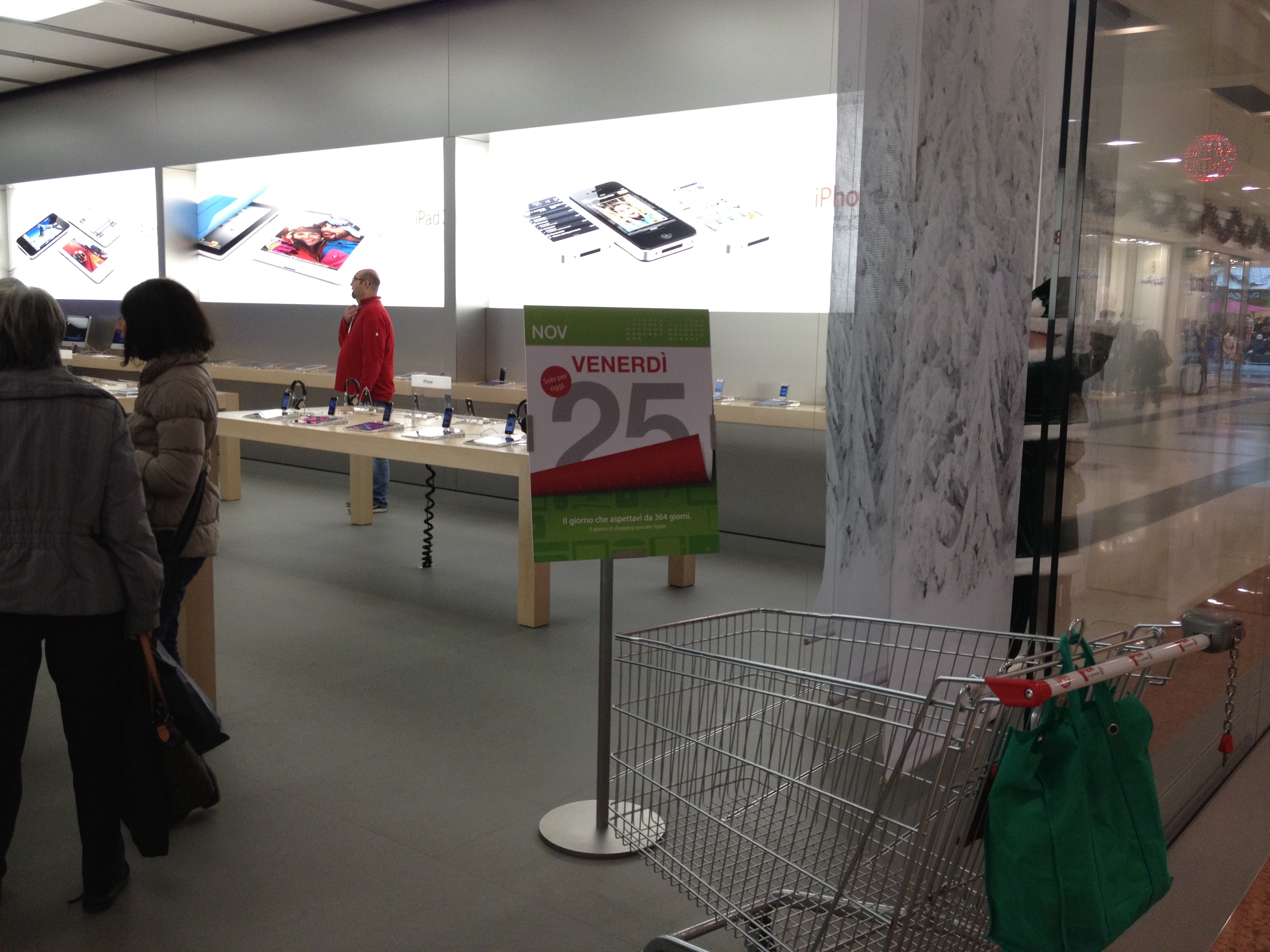 All’entrata è presente un cartello che informa tutti i clienti della presenza del Black Friday con sotto una simpatica frase: “Il giorno che aspettavi da 364 giorni”. Per chi non lo sapesse il Black Friday è un particolare evento nato negli USA, dove tutti i negozi, shop on line ecc. scontano i loro prodotti in modo sostanzioso. In Italia è poco diffuso ma la Apple ha voluto portare questa grande iniziativa anche in Italia. Potete consultare l’elenco di alcuni dei prodotti scontati qui.