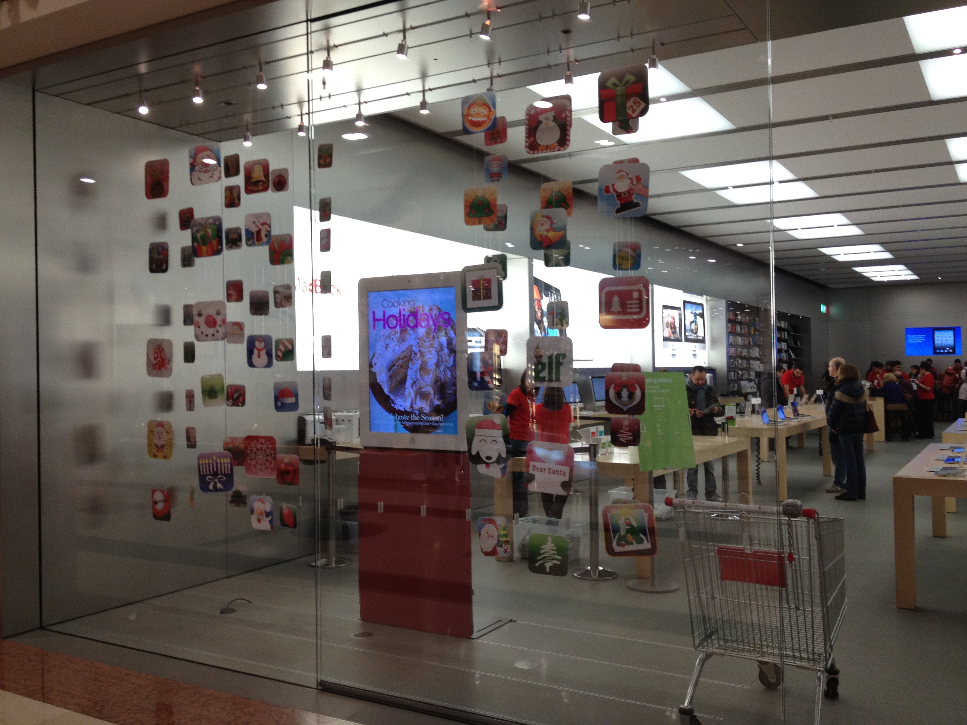 Salta subito all’occhio la t-shirt rosso fuoco, al posto della classica blu indossata da tutti i dipendenti Apple durante il resto dell’anno. Nella vetrina esterna è presente un iPhone 4S gigante di color bianco con due elfi che fanno finta di utilizzarlo, sopra l’iPhone campeggia la scritta “Direttamente dal Polo Nord”. Nell’altra vetrina è presente una cascata di cartoncini raffiguranti le icone di app natalizie e un iPad 2 gigante con una smart cover rossa, giusto per rimanere in tema.