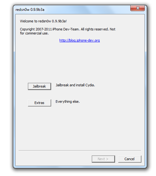 1. Avviate redsn0w 0.9.9 b8 e cliccate sul tasto Extras. (Nella guida la versione è 0.9.9b3a ma la versione che vi abbiamo linkato è più aggiornata ma esteticamente e funzionalmente identica)