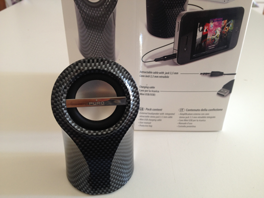 Estetica molto accattivante ed elegante grazie alle rifiniture in simil-carbonio, troviamo il logo Puro stampato sull’asta metallica frontale e sul retro specchiato dell’altoparlante.