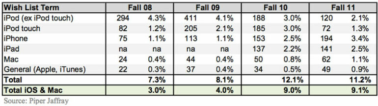 Sebbene soldi e vestiti siano ancora i più richiesti, anche gli iDevices occupano un’importantissima fetta della lista dei desideri dei teen-agers americani. Gli ultimi dati di Piper Jaffray dimostrano che i prodotti made in Cupertino stanno guadagnando sempre più popolarità tra i ragazzi negli ultimi quattro anni. L’azienda è stata monitorata assiduamente negli ultimi 11 anni, con sondaggi annuali effettuati tra 5.000 e 10.000 adolescenti ogni autunno.