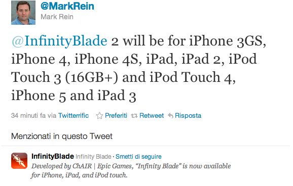 Sulla pagina Twitter di Mark Rein, vice presidente di Epic, è comparso un tweet piuttosto “strano”: secondo quest’ultimo infatti, Infinity Blade 2 funzionerà anche su iPhone 5 e iPad 3.