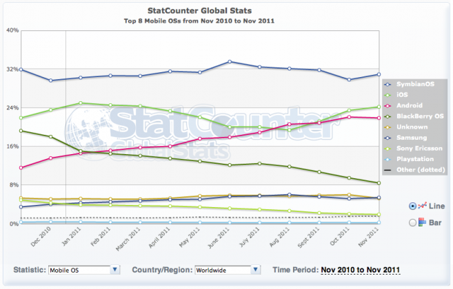 Grazie ai dati di Statcounter global, un servizio mobile di analisi rintracciato da tre milioni di siti, si nota che iOS nel novembre 2011 ha rappresentato per quasi un quarto i sistemi operativi mobili, passando da 23,48 per cento di ottobre al 24,21 per cento nel mese di novembre, mentre Android scende marginalmente da 22,11 parti per cento al 21,9 per cento.