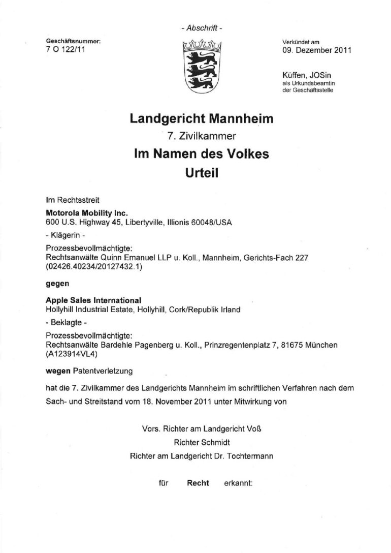 Importante vittoria per Motorola, dal momento che la corte tedesca di Mannheim ha stabilito la violazione di un brevetto da parte di Apple a seguito dell’azione legale intrapresa dal produttore del Razr lo scorso Aprile. In tale occasione la società di Cupertino venne accusata di aver realizzato dei dispositivi – iPhone 3G, 3GS, 4 e iPad di prima e seconda generazione – violando il brevetto numero 1010336 (b1) di proprietà della stesa Motorola.