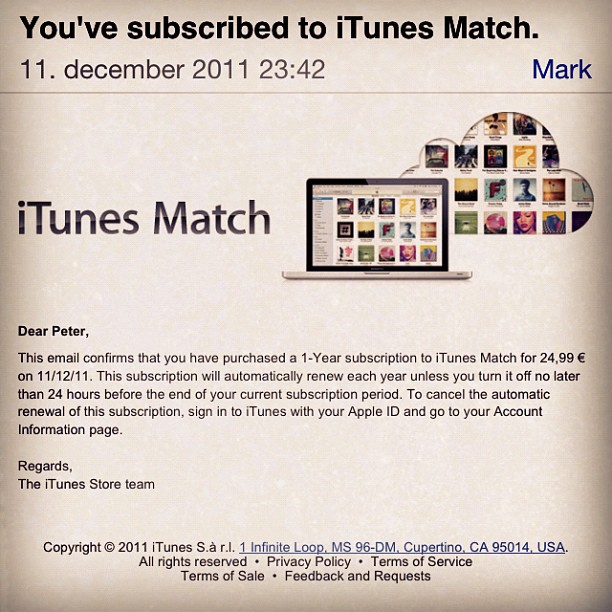 Inoltre un utente Twitter sostiene che è stato in grado di iscriversi al servizio in Europa, ma due giorni fa ha ricevuto un avviso su iTunes e gli sono stati rimborsati i soldi. Ecco il suo tweet: “Sono riuscito a comprare un abbonamento iTunes Match in Europa due giorni fa, ma ora mi hanno detto che c’era un errore e mi hanno restituito i soldi.”