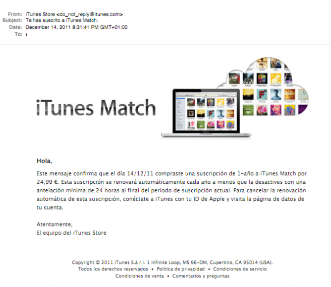 Iniziano a circolare in rete le prime immagini che ritraggono le email che Apple sta inviando a utenti in Spagna e nel resto d’Europa per informarli della disponibilità del servizio iTunes Match, per 24,99 € all’anno.