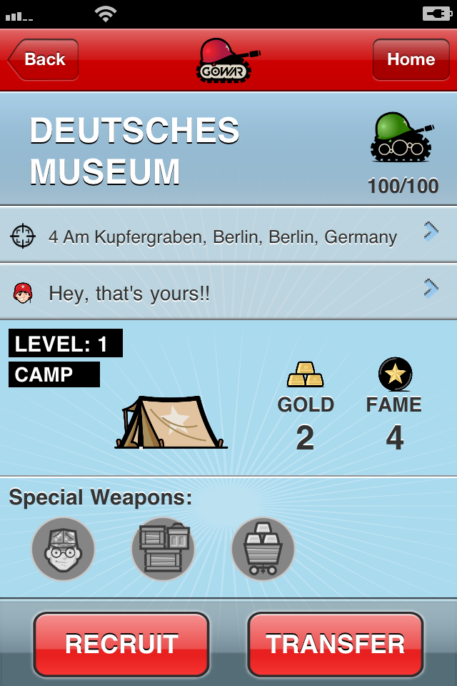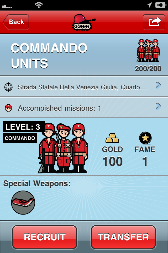 GoWar è un bellissimo social game geolocalizzato disponibile gratuitamente in Appstore che permette di sfidarsi in guerre virtuali alla conquista di luoghi reali. Riprendendo il concept del classico gioco “Risiko”, diventeremo i proprietari di un esercito chiamato Commando e potremo attaccare i nostri amici, definire la nostra strategia e difendere con onore i territori conquistati.