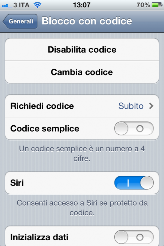 Non dovete far altro che andare in Impostazioni –> Generali e troverete l’opzione “Blocco con codice”, come potete vedere dallo screenshot