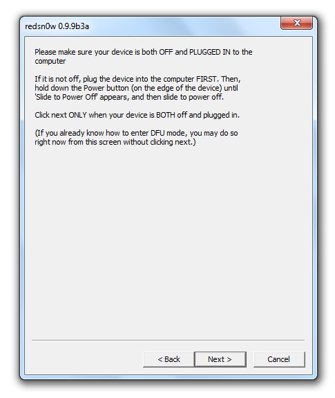 5. Per mettere il dispositivo in DFU (come indicato anche dalle istruzioni a schermo), premete il tasto Power per 3 secondi, dopo di che (senza rilasciare il tasto Power), tenete premuto il tasto Home per 10 secondi e infine rilasciate il tasto Power e continuate a premere il tasto Home finché redsn0w non riconoscerà il vostro dispositivo.