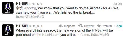 Qualche giorno fa abbiamo riportato che la nuova versione di h1siri, uno dei primi porting completo di Siri, sarebbe stata rilasciata a breve. Adesso il team di hacker asiatici ha annunciato, tramite il loro nuovo account twitter, che la nuova versione è finalmente pronta: si attende soltanto il rilascio del jailbreak untethered di iOS 5.
