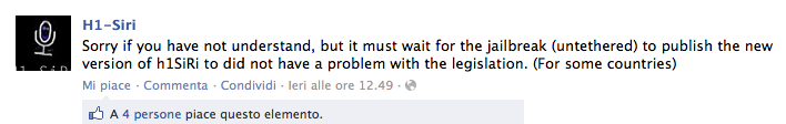 Per chi non l’avesse capito, dobbiamo aspettare il jailbreak untethered per pubblicare una nuova versione di h1siri per non avere problemi di legge.