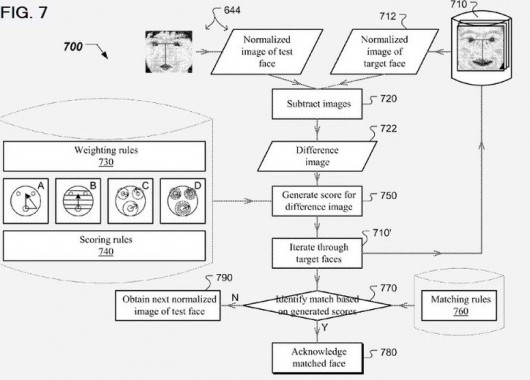Il metodo proposto nel brevetto prevede un elaboratore di immagini che compara la foto scattata con un sottoinsieme di riferimento. Questi modelli di riferimento includono informazioni circa la posizione e il tipo di occhi, di naso e di bocca. Per riconoscere il soggetto fotografato, l’elaboratore può prendere in considerazione la posizione degli occhi oppure la distanza tra gli occhi e la bocca. Il soggetto viene riconosciuto se la differenza tra le informazioni ricavate dalla foto scattata e quelle della foto di riferimento sono minime.