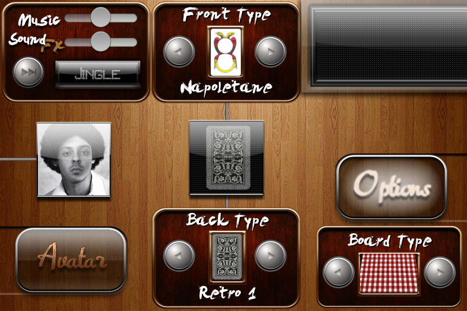 Passando al gioco in se, presenta come detto un’eccellente grafica, ben curata in ogni dettaglio: dal menù al tavolo di gioco. L’interfaccia è molto semplice e adatta a qualsiasi genere d’utente. Attraverso le opzioni potremo personalizzare l’ambiente di gioco e scegliere che tipo di carte usare tra Siciliane, Napoletane, Bergamasche, Piacentine, Trevisane o da Poker; personalizzarne il retro, scegliere il tavolo di gioco e inserire una foto del profilo scegliendola dal rullino o semplicemente scattandola istantaneamente.