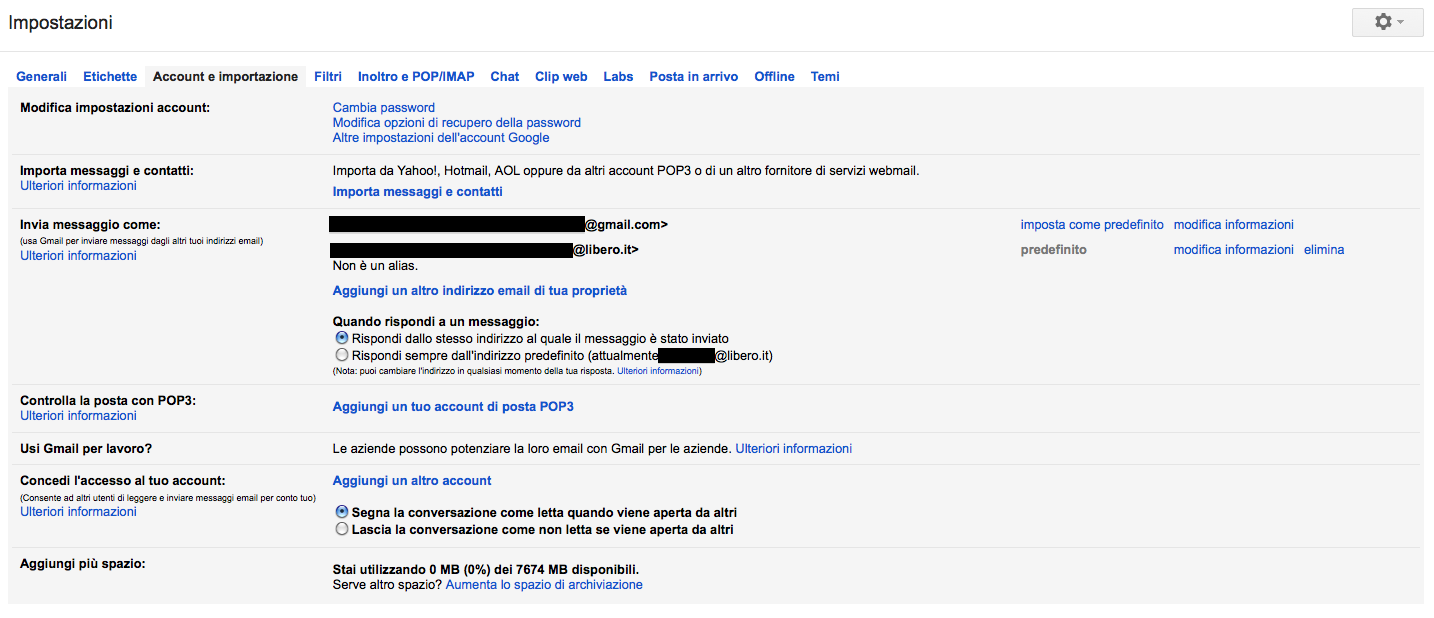 2. Passiamo ora a GMail dove, sempre dal pannello delle impostazioni, possiamo impostare l’invio di messaggi con un mittente diverso, cioè col nostro account di libero. Per fare ciò clicchiamo su Aggiungi un altro indirizzo di tua proprietà e seguiamo le istruzioni, togliendo la spunta da considera come un alias.