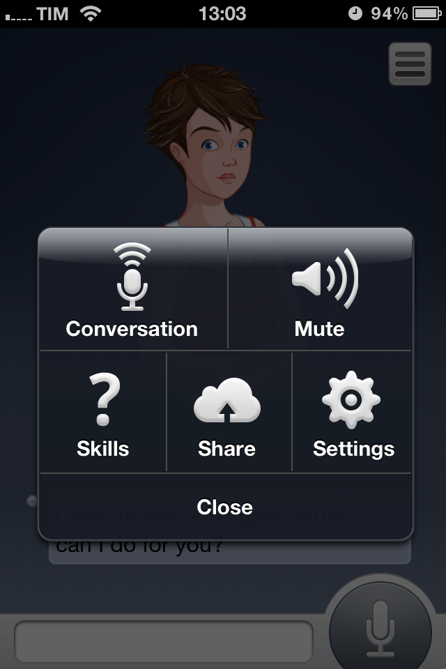 Dalle impostazioni (il quadratino in alto a destra) potremo decidere di disattivare la risposta audio tappando su Mute, nel caso ne avessimo bisogno. Sempre da questa schermata, potremo inoltre condividere le nostre ricerche su Facebook, Twitter, email ed altri tramite la funzione Share, visualizzare tutte le funzioni disponibili mediante il pannello Skills e cambiare le impostazioni grafiche in Settings.