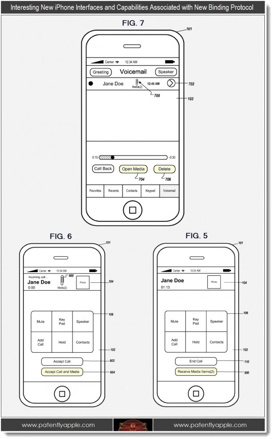 Il brevetto in questione illustra il protocollo studiato per permettere agli utenti di inviare allegati multimediali durante una telefonata. Le immagini depositate illustrano l’interfaccia di iOS con questo nuovo protocollo. L’invio attuale di contenuti multimediali è fattibile tramite diversi servizi quali gli MMS. Nel caso però fossimo al telefono con un nostro amico con il quale vogliamo condividere un file, dovremmo aprire l’applicazione con la quale si vuole spedire (per esempio mail) e compilare l’indirizzo del destinatario. Con il nuovo brevetto, Apple permette ai partecipanti di condividere i propri media direttamente al proprio interlocutore in modo semplice.