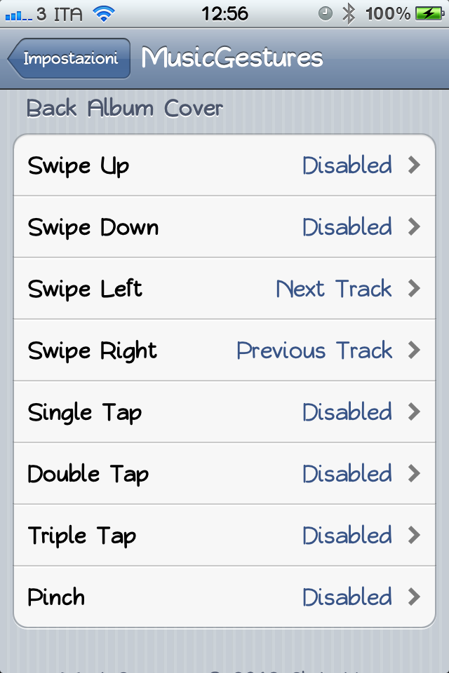 Il tweak è molto più semplice da usare che da spiegare: funziona solo nel programma Musica di iOS e permette la divisione dei comandi in base a due schermate, quando si visualizza la copertina frontale o quella posteriore di un album. Le impostazioni preselezionate sono: nella front-cover con lo swipe verso destra o sinistra di andrà a riprodurre il brano successivo o precedente della playlist (in modo casuale se è impostato il comando random), nella back-cover sempre con lo swipe si riprodurrà invece il brano successivo o precedente di quell’album.