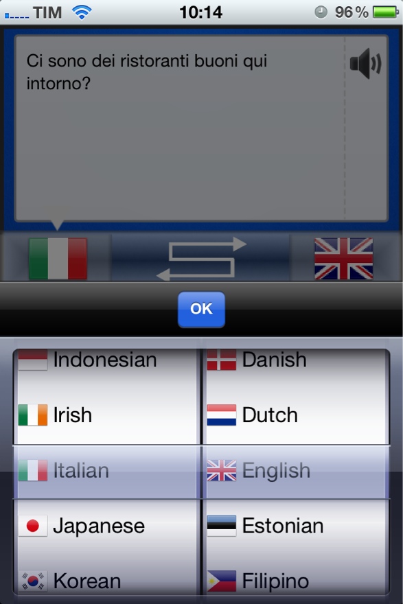 Al centro è posizionata la barra delle lingue. Facendo un tap sopra una delle due bandiere si aprirà un tool per selezionare entrambe le lingue che andremo ad utilizzare. Centralmente è posizionato un pulsante a forma di “S” che ci permetterà di invertire molto rapidamente le due lingue selezionate. E’ un punto a suo favore visto che eliminerà l’inversione delle lingue tramite il normale pannello, nel caso in cui avremo la necessità di passare il dispositivo all’interlocutore per avere un veloce botta e risposta.