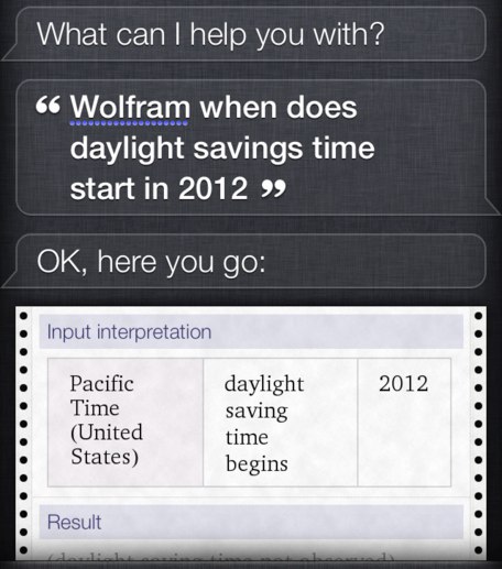 Il primo è quello di chiederlo con Wolfram|Alpha. Anche se Siri è estremamente esigente riguardo la pronuncia di “Wolfram” (provate con “Wolfrum” pronunciandolo molto velocemente in modo da non farlo sembrare composto da due parole distinte). In questo modo otterremo l’ora legale esatta, anche per l’ora del Pacifico (USA).