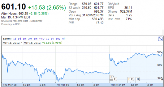 Apple ha superato per la prima volta nella sua storia la soglia dei 600 dollari per azione. Una meta incredibile, per la società californiana, che appena un mese fa aveva scavalcato i 500 dollari per azione, puntando ora verso il traguardo dei 700 dollari per azione, non più un obiettivo irragiungibile, soprattutto in virtù del prossimo lancio di alcuni prodotti di punta della gamma di proposte della mela morsicata.
