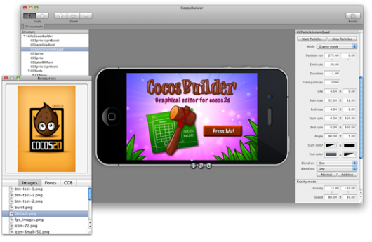 CocosBuilder è un altro strumento pensato per gli sviluppatori. Si tratta di un’interfaccia grafica per configurare tutti i vari elementi e widget utilizzati in Cocos2D. Da poco CocosBuilder ha rilasciato la versione 1.1 open source, il che significa che chiunque può scaricare il programma e utilizzarlo per costruire le proprie scene con Cocos2D.