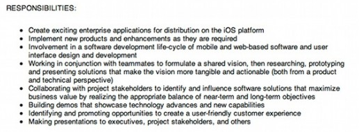L’offerta di lavoro, è stata resa pubblica martedì scorso per poi essere rimossa appena dopo due giorni. Questa offerta riguarda un posto a lungo termine per qualcuno in grado di sviluppare “esaltanti applicazioni per la distribuzione sulla piattaforma iOS”.
