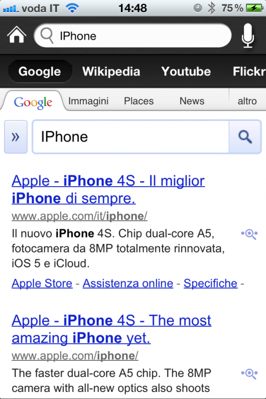 I risultati appariranno, come abbiamo stabilito, nella pagina del motore di ricerca selezionato nelle impostazioni. Altrimenti, nella barra sotto la ricerca, potremo modificare la nostra scelta, andando a trovare i risultati anche su Wikipedia, Youtube, Flickr o Twitter.