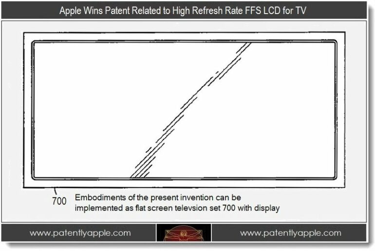 Il brevetto concesso ad Apple, illustra quindi una tecnologia TFT LCD FFS con elevata frequenza di aggiornamento senza limitare l’apertura dei singoli pixel. I vantaggi sarebbero quindi l’ottenimento di una migliore gamma di colori e luminosità con un ampio angolo di visione. In alcune immagini depositate, viene illustrato l’impiego di tale tecnologia in vari dispositivi, come ad esempio un televisore (FIG.7).