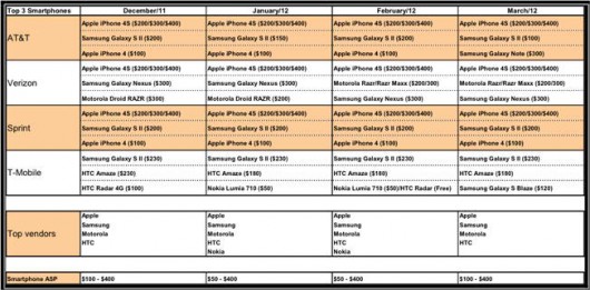 Sebbene l’iPhone 4S resti sempre lo smartphone più venduto in ogni vettore statunitense, Samsung sta lavorando sodo per espandere le proprie vendite e spodestare la concorrenza, conquistando il secondo posto.