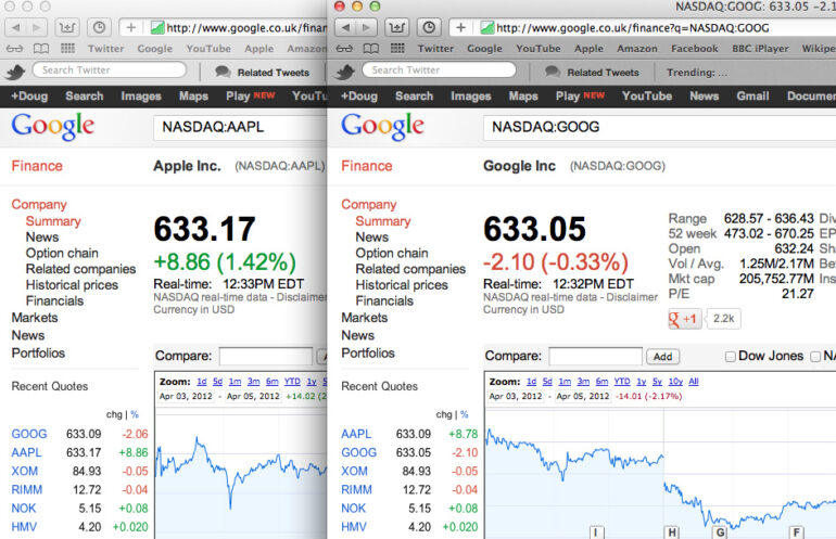 Il titolo Apple continua a volare alto (e secondo gli analisti continuerà ancora a crescere) e oggi la casa della mela segna un’altra vittoria (per altro decisamente simbolica) nei confronti del rivale di Mountain View. Le azioni Apple in questo momento, infatti, superano quelle di Google assestandosi a quota 633.17$ per azione.