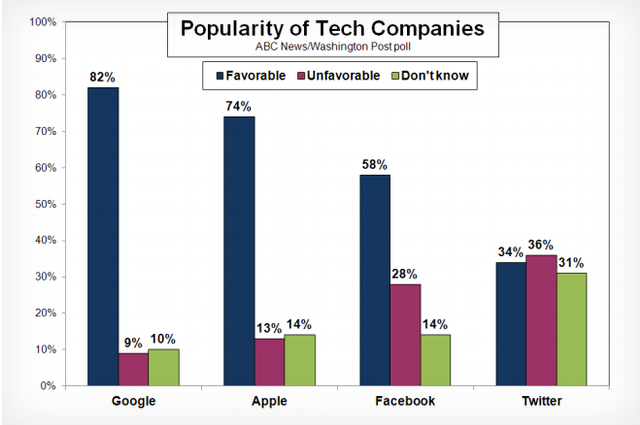 Il sondaggio – sottoposto a 1007 adulti – ha avuto come obiettivo quello di registra le opinioni – favorevoli o meno – degli utenti su alcuni dei principali player del settore tecnologico: Google, Apple, Facebook e Twitter. Quattro aziende che, in modi diversi, rappresentano attualmente le big four del settore Hi-Tech.
