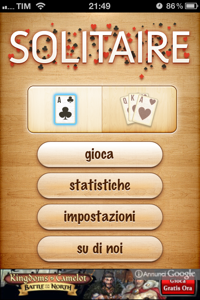Dal menù principale comunque, avremo tutto a portata di mano: il pannello delle precedentemente citate impostazioni, quello per le info sugli sviluppatori, il pannello delle statistiche (dal quale potremo visualizzare tutti i punteggi delle partite o le info di gioco, per conoscere in che modo ci verranno dati o sottratti i punti durante una partita) ed infine il più utile pannello per cominciare una nuova partita o riprenderne una in pausa. Sempre nella home, avremo due pulsanti sulla parte superiore dove potremo decidere di selezionare il tipo di carte che verranno scoperte quando selezioneremo il mazzo durante una partita: per essere precisi, potremo decidere se scoprire una carta per volta o rendere le cose più difficili attivando l’opzione 3 a 3.