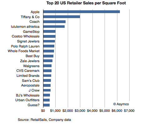 Il successo di una catena di negozi si misura di solito con vendite per unità di superficie. RetailSails ha compilato la tabella sovrastante considerando 160 retail statunitensi, esclusi i ristoranti, che hanno comunicato ufficialmente i propri dati. Al primo posto tra i negozi con il più alto rapporto di vendite su square foot c’è Apple con i suoi Apple Store, seguita da Tiffany e Coach.