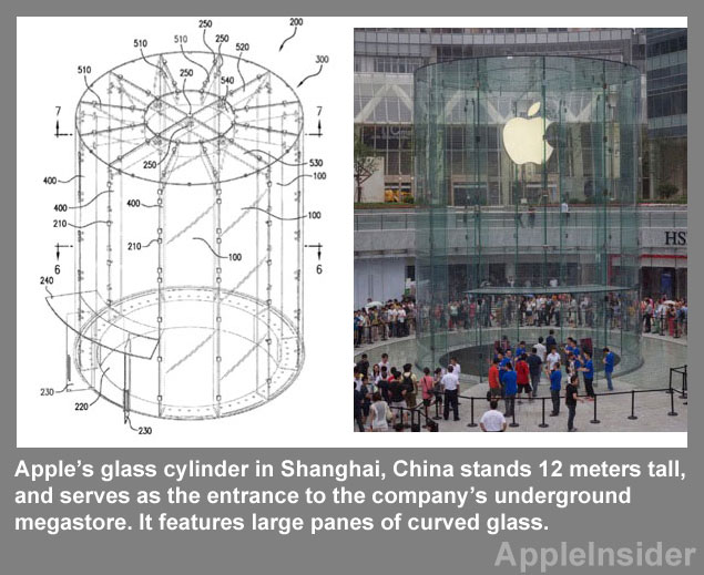 Apple ha depositato una domanda di brevetto per il massiccio ed elaborato cilindro di vetro che funge da ingresso al suo megastore a Shanghai, in Cina. Il negozio, che ha aperto a metà 2010, è simile allo store della Fifth Avenue di New York.