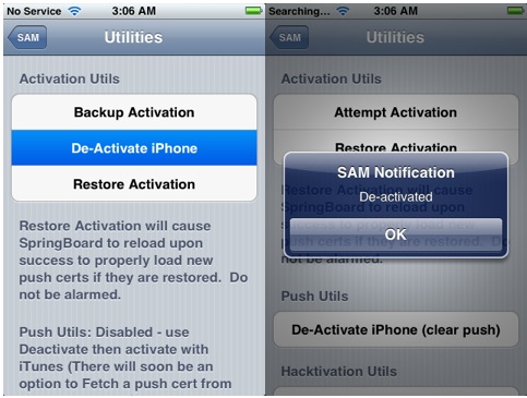 NB: se dopo aver effettuato questa procedura per sbloccare la parte telefonica dell’iPhone, non ricevete più le notifiche push queste potranno essere ripristinate semplicemente aprendo SAMPrefs e premendo su Clear push. Quindi collegate l’iPhone ad iTunes, e le notifiche push dovrebbero tornare a funzionare.