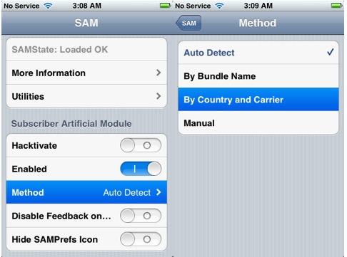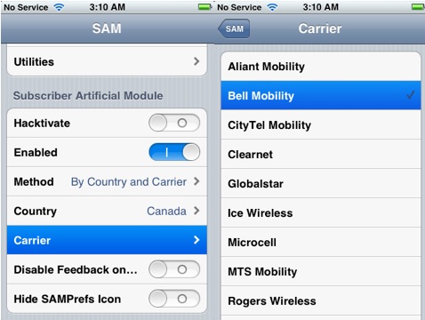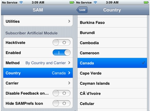 - Dopo aver attivato il tweak SAM, selezionate By Country and Carrier in Method. Arriva ora un passaggio fondamentale per la corretta riuscita della guida: dobbiamo selezionare innanzitutto in Country la nazionalità dell’operatore con cui iPhone è bloccato di fabbrica. Per esempio, se il vostro iPhone funziona con carrier canadesi, dovrete selezionare Canada (come in figura). In seguito dovrete selezionare l’operatore telefonico con cui iPhone è bloccato di fabbrica: come nell’esempio precedente, se iPhone può essere utilizzato solo con SIM AT&T dovrete selezionare questo operatore.
