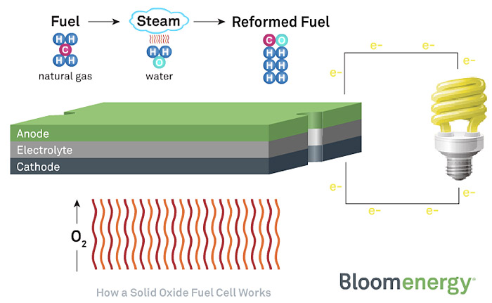 Le celle a combustibile in questione, le Bloom-Box riescono ad immagazzinare energia elettrica da fonti non rinnovabili come il gas naturale o il biogas costituito in gran parte dal metano emesso dalle piante o dalla vegetazione in decomposizione. Bloom afferma che questo metodo assicurerebbe sia una ridotta emissione di carbonio di almeno un 40-50%, che una conversione più efficiente della potenza rispetto alle tradizionali linee elettriche in U.S.A.in cui parte di questa potenza si perderebbe durante il “lungo viaggio” attraverso i chilometrici cavi standard.