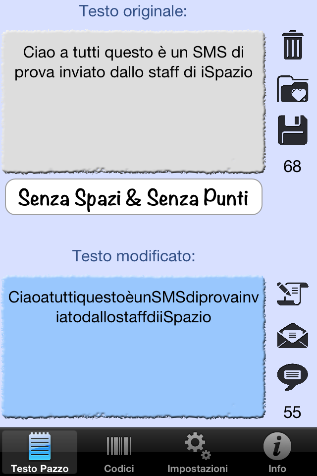 Riguardo l’area corrispondente al Testo Modificato invece, avremo: il primo simbolo (una foglio con una penna) che ci copierà tutto il messaggio negli appunti, così che da poter decidere di utilizzarlo con qualsiasi applicazione esterna; il secondo simbolo (la busta) per aprire l’applicazione nativa Mail ed avere già il messaggio inserito nel corpo della mail; il terzo simbolo (il fumetto) per aprire l’applicazione nativa Messaggi con il testo già inserito.