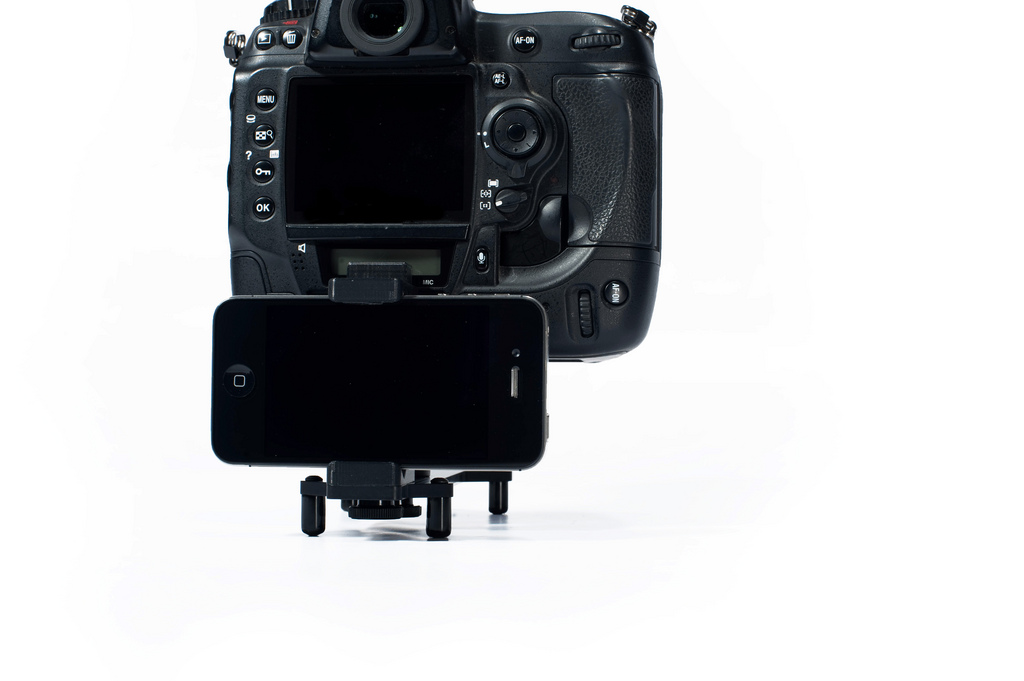 iCandy è un supporto universale che ci permette di fissare sullo stesso sostegno sia una Reflex che un iPhone per rendere più semplice e veloce, al soggetto da fotografare, il giusto posizionamento per una foto sicuramente migliore. Il punto di attacco per il nostro iPhone ha la possibilità di essere orientato a 360 gradi, davvero versatile sia per il soggetto della foto che per il fotografo stesso. Quindi per facilitare il posizionamento del soggetto della foto, basterà montare (come nella foto qui sotto) l’iPhone e la Reflex e utilizzare la fotocamera frontale del nostro iDevices per permettere al soggetto di specchiarsi nello schermo dell’iPhone che, puntato nella stessa direzione della Reflex, consentirà foto decisamente più precise.