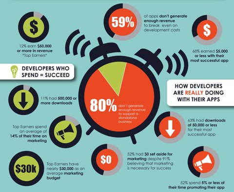 AppPromo ha analizzato questo dato, molto importante per tutti gli sviluppatori che hanno intenzione di lanciarsi in questo nuovo mondo, ed ha calcolato che solo il 41% di tutti gli sviluppatori riescono a coprire tutte le spese sostenute per realizzare l’applicazione, quali grafica, marketing, ecc… Oggi giorno ci sono anche moltissime aziende che sviluppano app davvero ben fatte e in questi casi è proprio il lavoro di squadra che permette all’applicazione di riuscire a vendere, e anche bene, sull’AppStore.