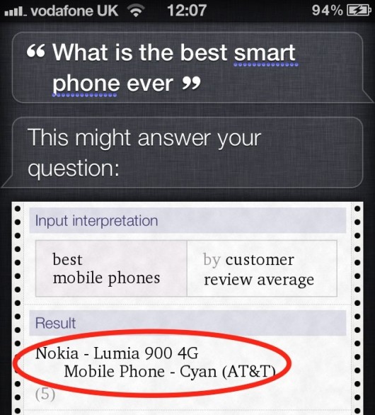Perciò questo “tradimento” di Siri nei confronti di Apple e dell’iPhone 4S, non è legato alla tecnologia in sè, ma ad una ricerca effettuata online sul motore Wolfram Alpha. Quest’ultimo aggiunge anche ulteriori dettagli a questa risposta, affermando che il Lumia 900 più apprezzato dagli utenti che hanno lasciato una recensione in rete è quello di color Cyan con operatore AT&T. Voi cosa ne pensate?