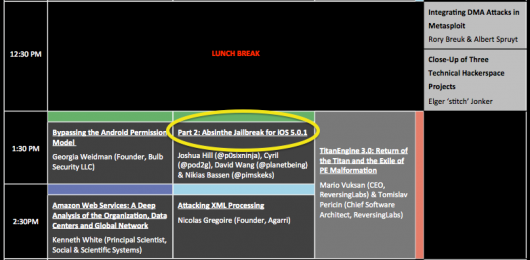 Domani sono previsti due interventi il primo la mattina che riguarda Corona e il Jailbreak per iOS 5.0.1, mentre dopo la pausa pranzo alle 13.30 ci sarà un intervento che riguarderà Absinthe quindi il Jaibreak per iOS 5.1.1 (nell’agenda della conferenza compare iOS 5.0.1, ma dovrebbe essere un errore di battitura).