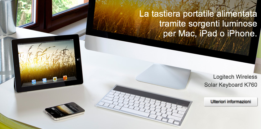Logitech presenta la sua nuova tastiera Wireless Solar Keyboard K760. Le sua più grandi particolarità sono senza dubbio la presenza di un piccolo pannello solare che ne permette l’alimentazione e la possibilità di essere utilizzata simultaneamente con 3 dispositivi diversi.