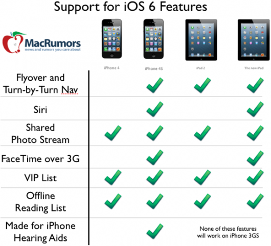 I Ragazzi di MacRumors hanno stilato questa tabella che riporta le principali funzionalità introdotte e le rispettive limitazioni sui terminali. Come già molti di voi sapranno la prima versione di iPad non verrà aggiornata affatto ad iOS 6 essendo, quest’ultimo, ormai fuori produzione. Resta aggiornabile l’eterno iPhone 3GS, e questa è certamente una buona notizia, sebbene le novità più importanti non siano state introdotte per questo dispositivo.