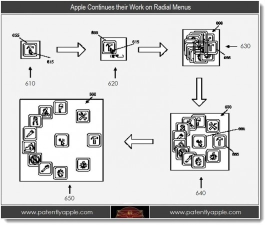 Potrebbe quindi esserci una sostanziale modifica ai menù dei device da parte di Apple. Questo menù radiale potrebbe essere il nuovo sistema di distribuzione delle icone a schermo per tutti i supporti dell’azienda di Cupertino, che già in passato aveva brevettato un sistema simile, con delle icone raggruppate che andavano ad aprirsi a raggio mostrando anche dei sottogruppi a secondo dell’icona richiesta. Ora il brevetto sarebbe stato ufficialmente depositato per il futuro dell’iOS e di OS X.