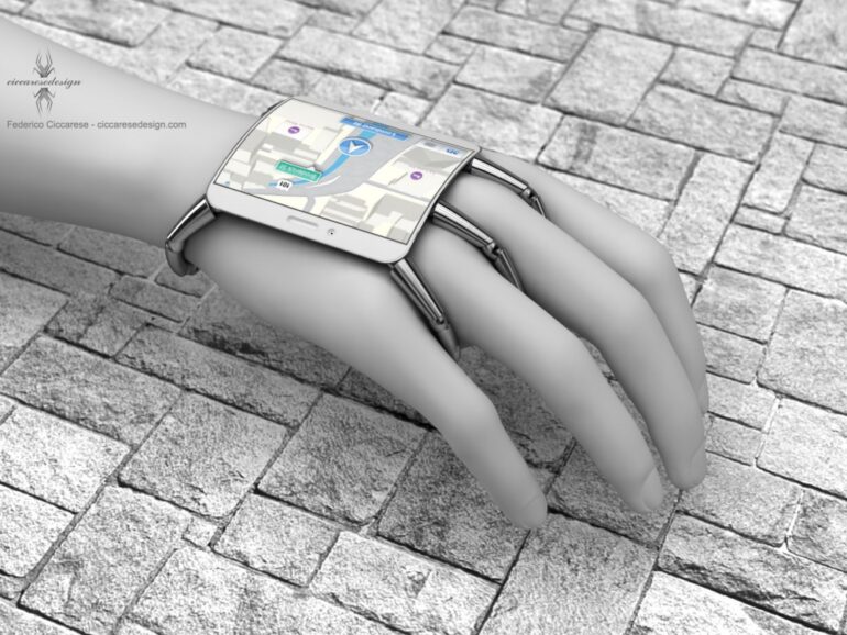 Federico ha immaginato perciò il dispositivo che vedete nelle immagini che vi mostriamo in questo articolo. Questa sorta di iPhone super sottile e leggero, è costruito con un materiale flessibile che permette al dispositivo di essere indossato sulla mano dell’utente.
