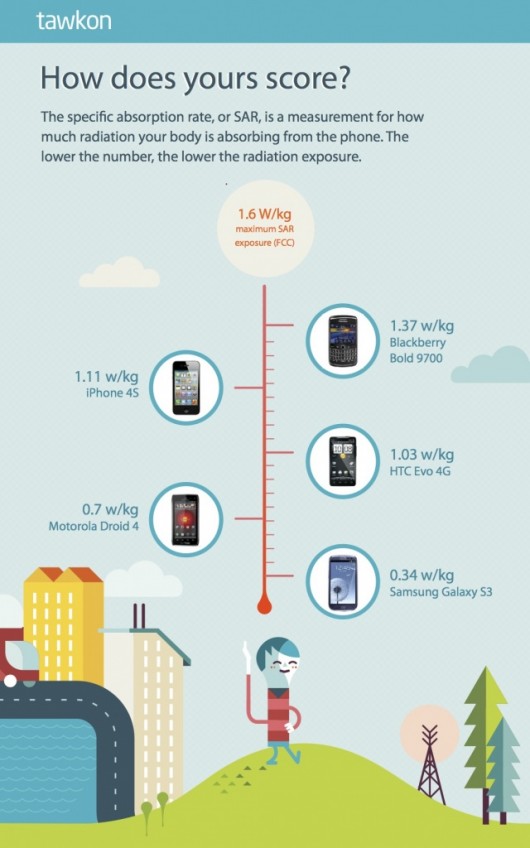 Tornando al merito della notizia, tawkon ha creato un’infografica inserendo all’interno alcuni degli smartphone più famosi presenti sul mercato ordinati per quantità di emissione elettromagnetica.